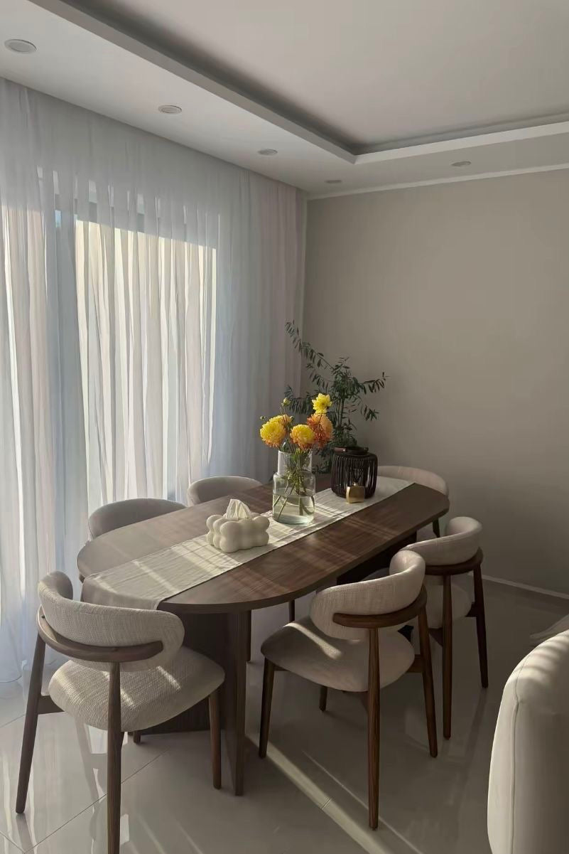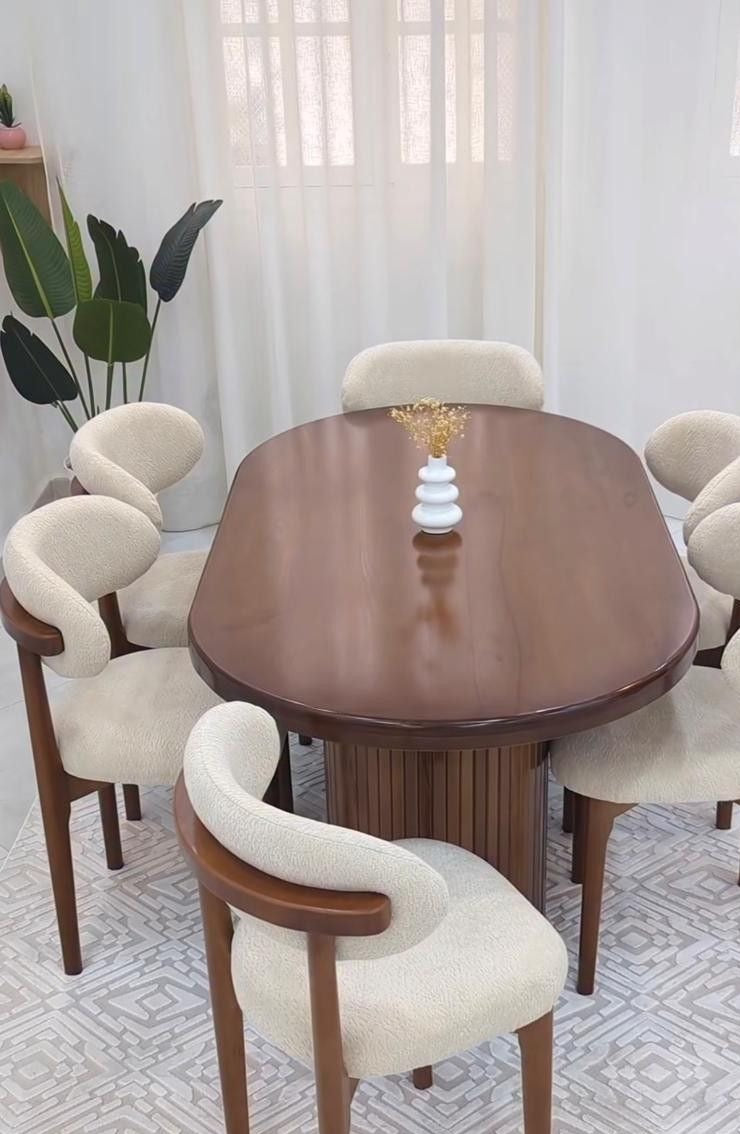 Alliant un design contemporain à des finitions haut de gamme, cet ensemble associe une table ovale sculpturale à six chaises bouclées ultra confortables, pour une expérience à la fois esthétique et fonctionnelle.