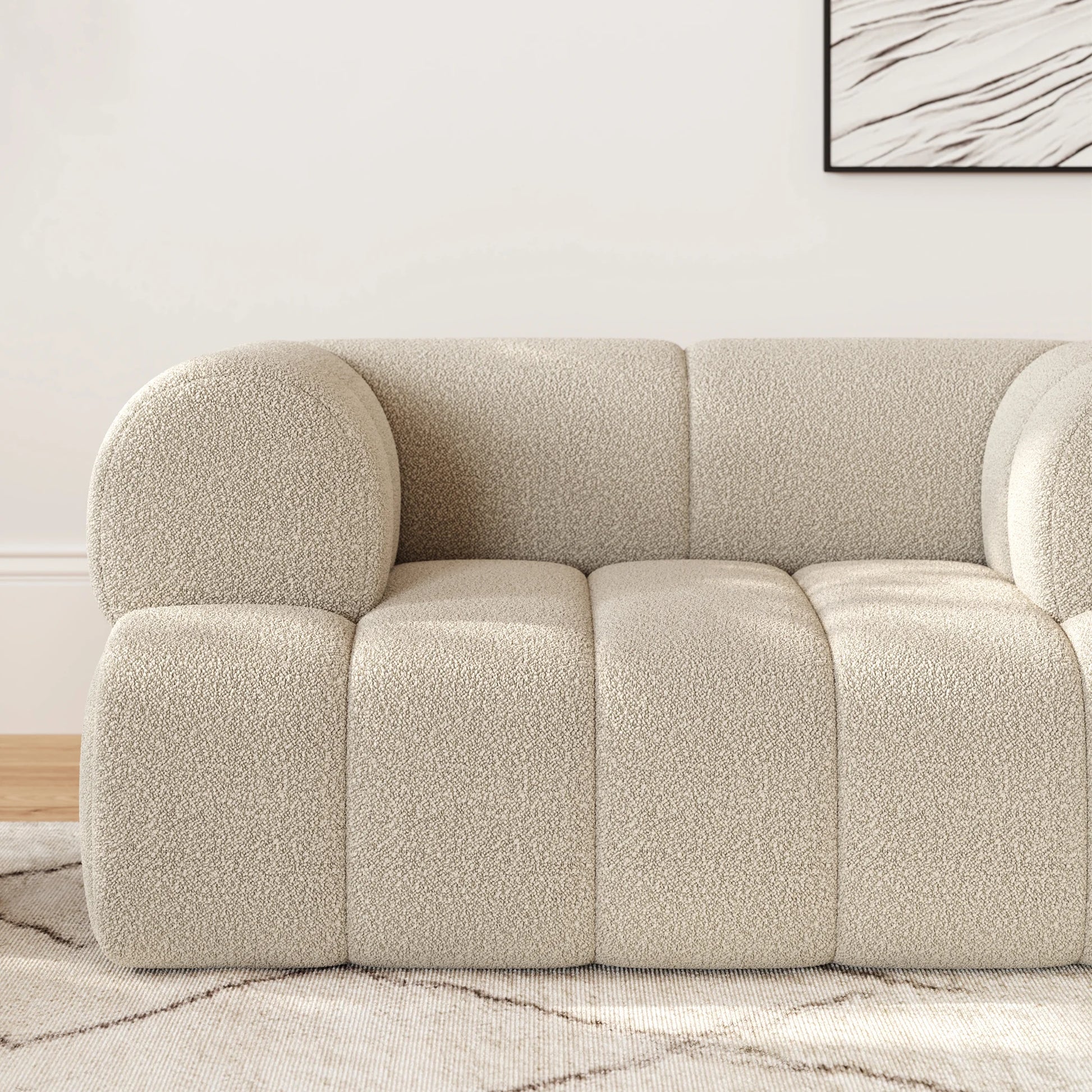 Adoptez une élégance douillette avec ce fauteuil d'appoint en bouclé, confectionné avec un tissu doux en laine d'agneau pour une sensation texturée semblable à un nuage. Son design surdimensionné et moelleux invite à la détente, tandis que les coutures structurées ajoutent une touche de sophistication moderne. Parfait pour n'importe quel salon ou coin lecture.