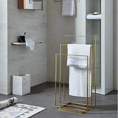 Le support carré en métal pour majordome place trois serviettes de bain sur le mur. Intelligent et design.