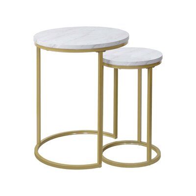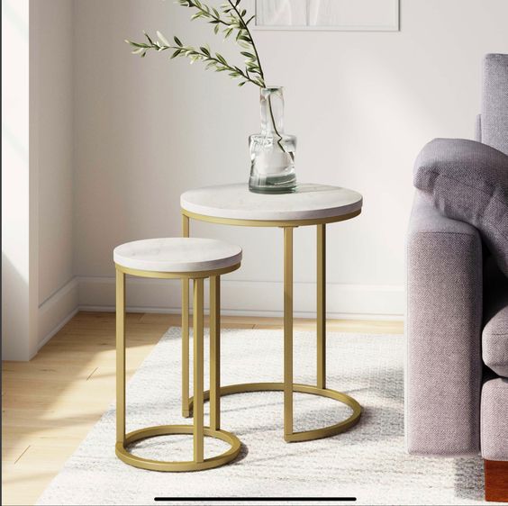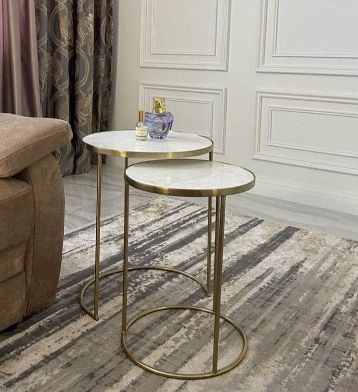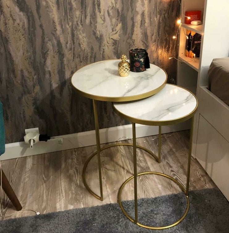 The two nesting tables. With their perfect marble effect and wrought iron construction for a clean, simple design, these coffee tables are sure to suit any living room style. Inspired by European industrial furniture, they combine practicality and space-saving design to fit seamlessly into your living room.
