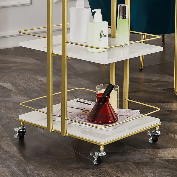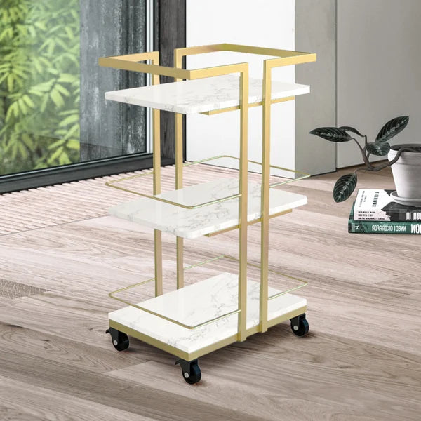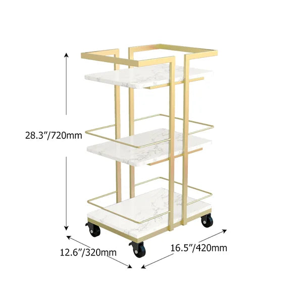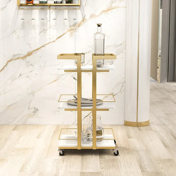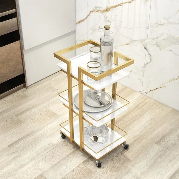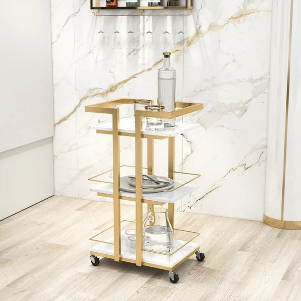 Apportez un style épuré à votre espace avec ce chariot de bar carré moderne. Confectionné en métal dans une finition dorée, ce chariot de bar affiche une silhouette rectangulaire à 3 niveaux sur 4 roulettes. Dispose de garde-corps latéraux élégants, l'étagère en marbre crée un endroit pratique pour ranger les mélangeurs et les poignées d'alcool, tout en ajoutant un look chic et unique. Pour compléter le design, les poignées intégrées et les quatre roulettes offrent une mobilité sans effort.