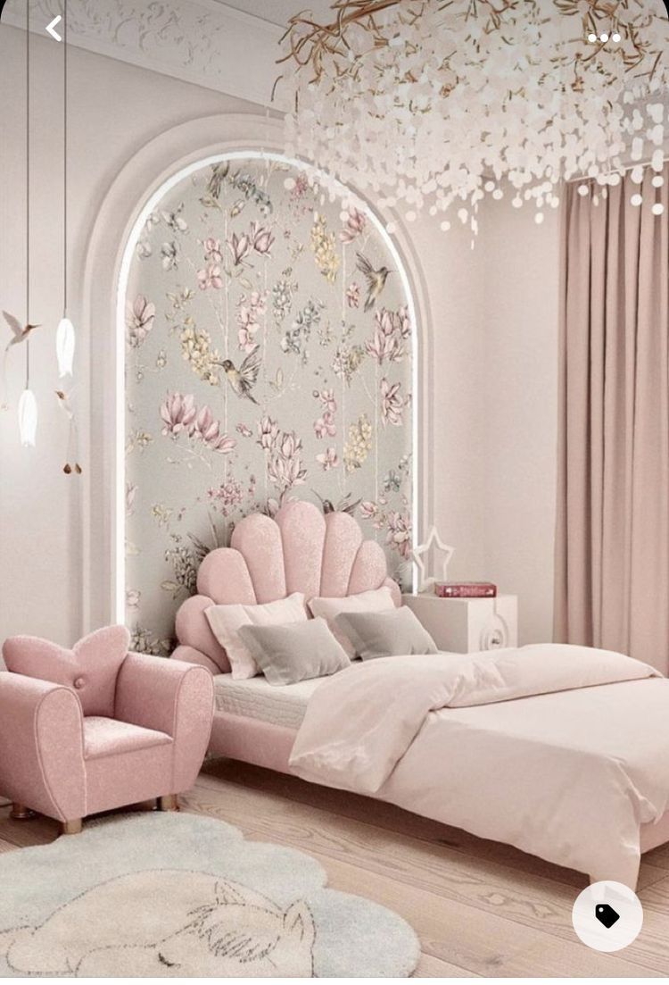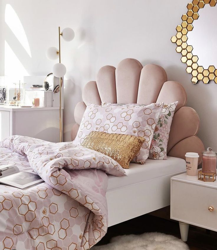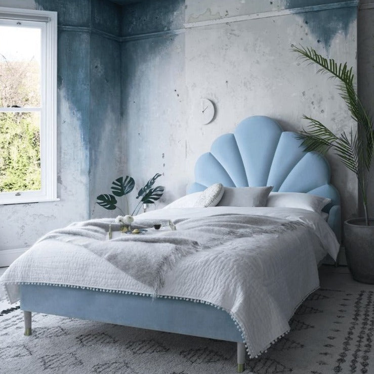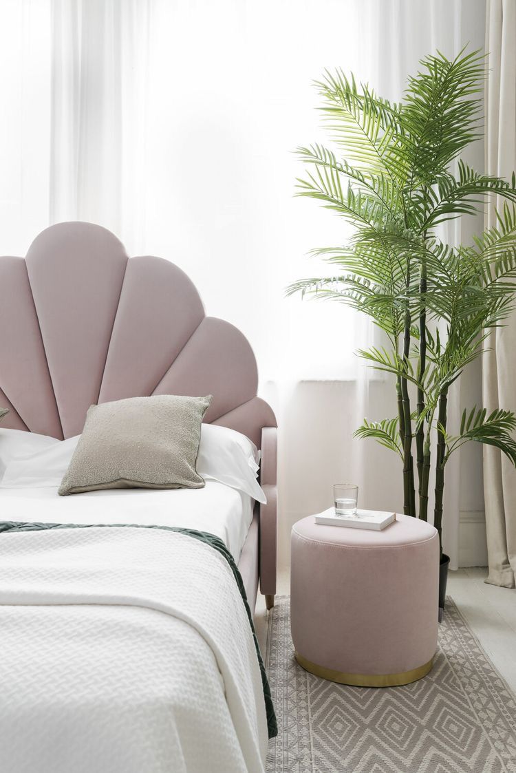 Avec sa somptueuse tête de lit en forme de coquillage et son revêtement en velours rose, ce lit apportera de la douceur à votre chambre.